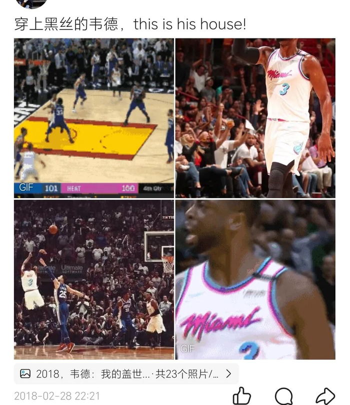 有一些巴特勒球迷对我有抱怨,不满我对巴特勒上赛季一些风波行为的批评,也不满我在斯波、巴特勒和哈斯勒姆发生冲突时“维护哈老狗”的行为。但实际上,我一直是认定“团队至上”理念的人,而我对于热火的一切热爱都起源于韦德(而哈队又是韦德最坚实的老友),并且,我的微信朋友圈封面从2019年的那次更新后,就从未更换过: