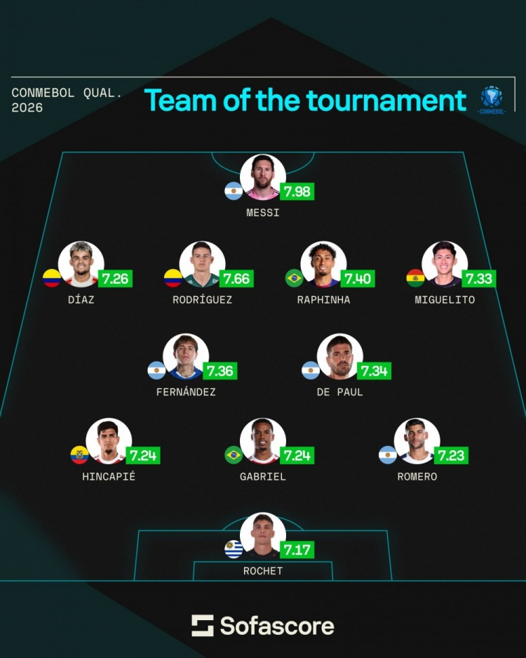 在南美世预赛全部结束后,有著名机构Sofascore就根据球员表现评选出南美世预赛的最佳阵容,梅西毫无悬念领衔,他的场均评分全南美第一,接近8分。实话说,这算梅西放水了,因为他一般都超过8分,甚至接近8.5那种。梅西场均7.98分。